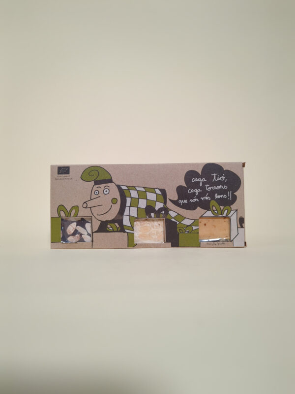 Una cajita con el Tió que «caga» tres tipos de turrones. Turrones artesanos, ecológicos y sin gluten